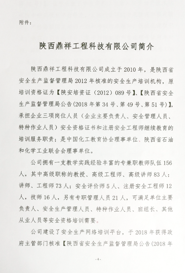 陜西鼎祥始終致力于“以安全科學(xué)技術(shù)為核心,國家安全生產(chǎn)法律法規(guī)為準則,企業(yè)安全文化為靈魂,創(chuàng)新安全培訓(xùn),提升安全技能,為生命安康護航”。通過與政府主管部門、企業(yè)之間的協(xié)同效應(yīng),提升安全培訓(xùn)效果!促進企業(yè)安全文化建設(shè)不斷發(fā)展!我們將孜孜追求、不懈努力,提升從業(yè)人員安全意識與安全技能,為客戶創(chuàng)造更為安全的生產(chǎn)條件。