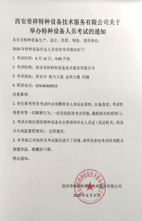 西安帝祥特種設備技術服務有限公司根據(jù)通知精神,為給考生提供安全、清潔的考場環(huán)境,本考點做了大量準備工作,對考場進行全面消殺,做好室內(nèi)通風,保證考場符合良好的衛(wèi)生要求。決定于2020年6月16日舉辦特種設備人員考試工作。
