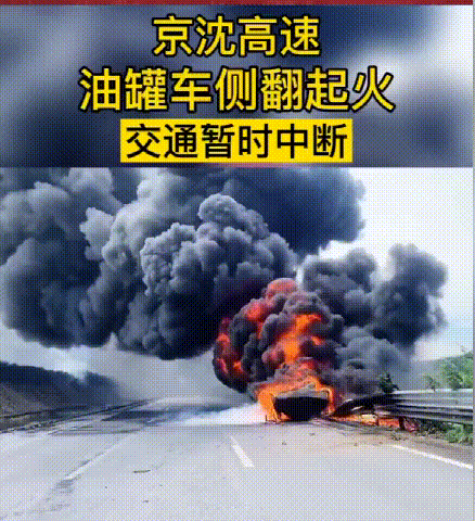 京沈高速遼寧錦州段沈陽方向452公里處一輛油罐車和廂貨車相撞起火